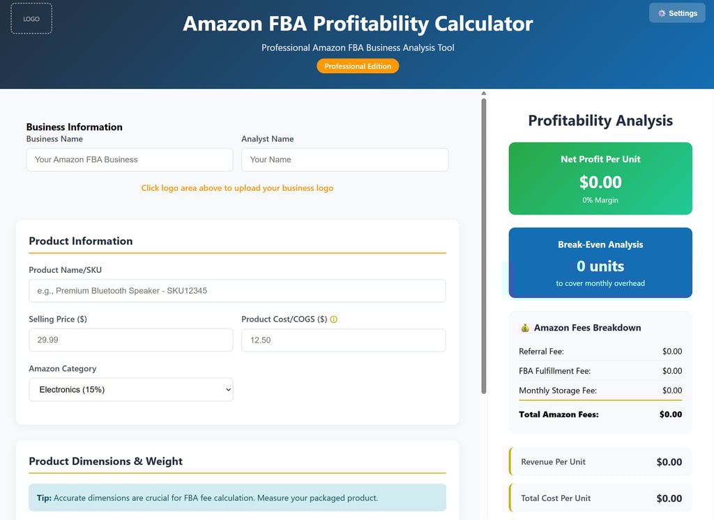 This professional-grade calculator provides complete profitability analysis for Amazon FBA products by accounting for all the costs and fees associated with selling on Amazon's platform. It goes far beyond simple profit calculations to give you a complete financial picture of each product opportunity.